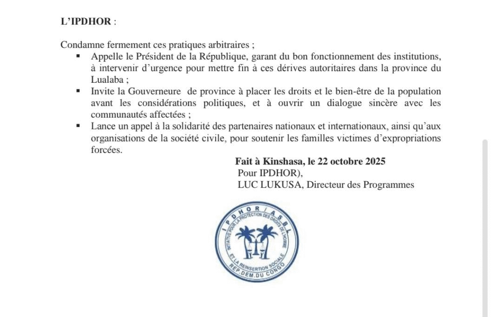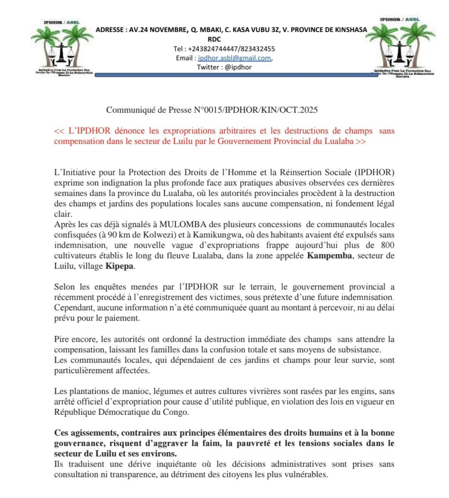 L’Initiative pour la Protection des Droits de l’Homme et la Réinsertion Sociale (IPDHOR) dénonce une grave injustice en cours dans la province du Lualaba, RDC.